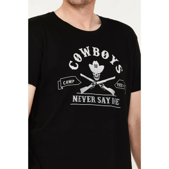 - “Camp Yee-Haw Cowboys Never Say Die” with cowboy skull and shotguns graphic on front