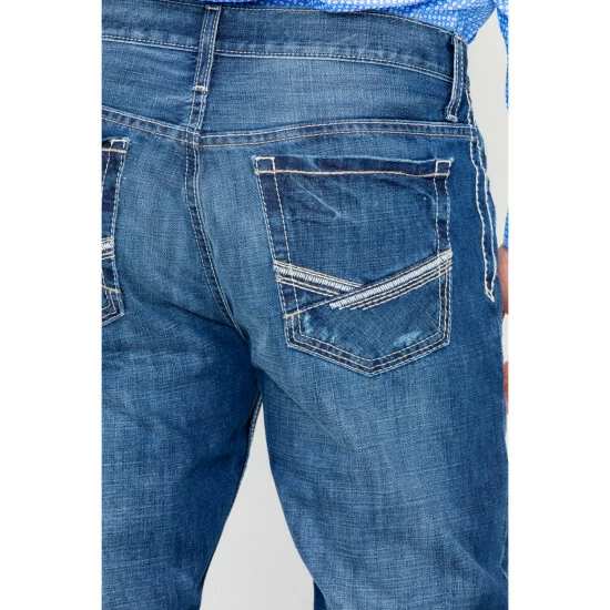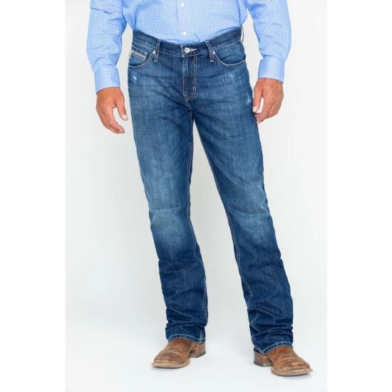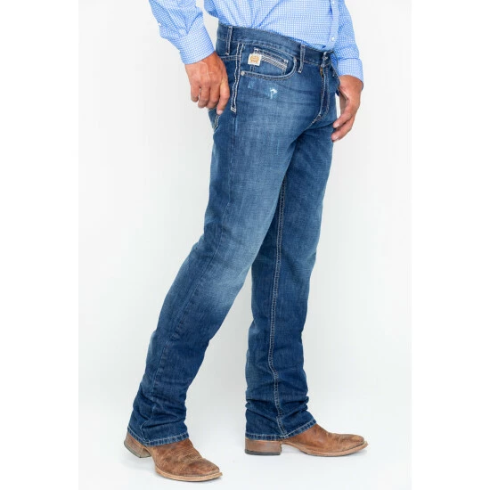The most fashion-forward and slim fit in the Cinch jeanline-up is the Ian jean. Made from tough, 11.7 oz. denim, these jeans have a mid-rise waist, and a slim fit through the hip and thigh for a lean and mean look. The dark stonewash finish is further enhanced with whiskers, chevrons, tacking and destruction details plus decorative back pockets. Tough enough for the rodeo arena, yet fashionable enough for a night on the town, sport great cowboy style with the Ian jeans from Cinch.
