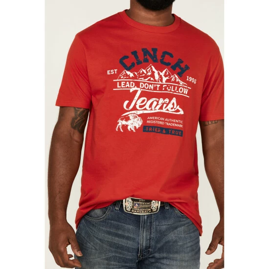 - “Cinch Jeans Lead Don’t Follow” with mountains and buffalo graphic on front