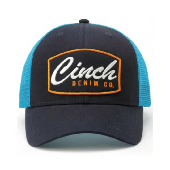- Orange, navy and white “Cinch Denim Co.” patch on front