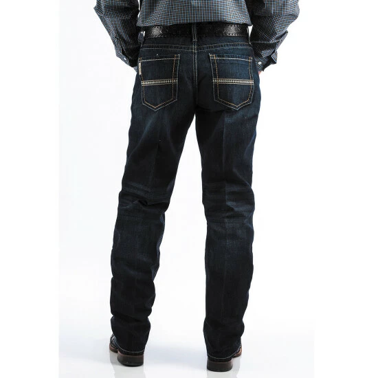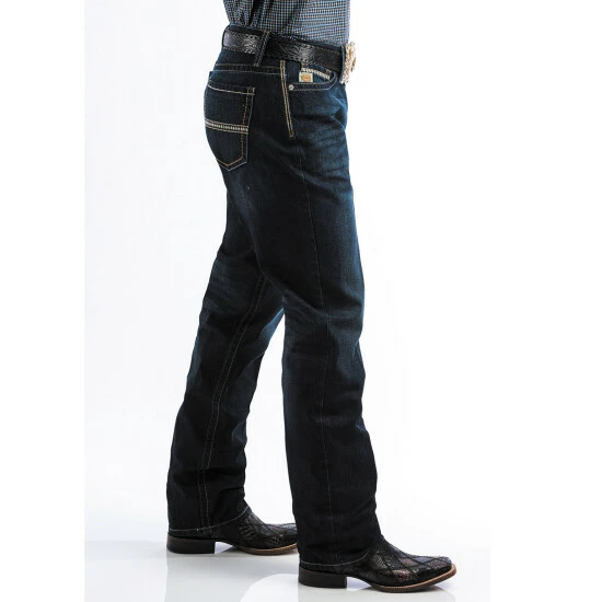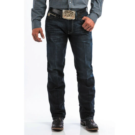 Get the classic cowboy look in these Cinch jeans! Made with comfort in mind they feature extra room for your thigh and hips. The loose boot cut jeans have dual stitching, hand sanding, whiskers, and decorative back pockets. Pair with a tee and boots!