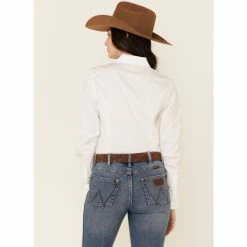 Cinch women’s shirts are designed to provide classic and timeless fashion for women in and out of the arena. This shirt is both performance ready and eye-catching. Made of cotton, it has solid white coloring with white buttons along the front placket and cuffs, plus white logo embroidery on the left chest pocket. Pair with jeans and cowgirl boots for a timeless look you’ll want to wear again and again.