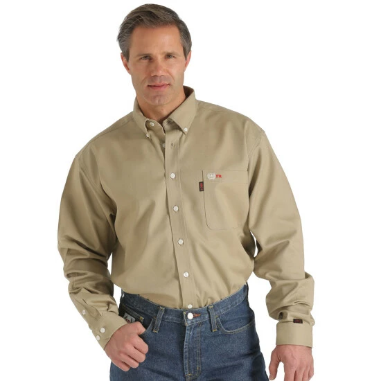 Thanks to Cinch, you don’t have to sacrifice style for safety on the jobsite! This button-down men’s shirt is made of khaki 100% cotton twill. The fabric has been treated to be HRC-2, ATPV 8.5 flame-resistant. A button-front placket and cuffs feature white pearl logo-stamped buttons. The Cinch logo tag and embroidery are located on the left chest pocket.